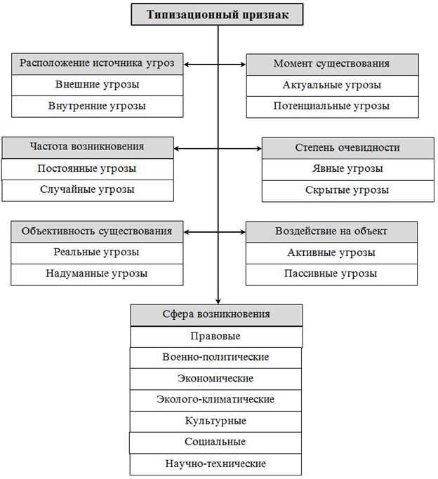 Перечень приведенных выше способов классификации угроз экономической безопасности предприятия, очевидно, не является исчерпывающим и может включать в себя целый ряд других признаков. Типизация угроз по сфере их возникновения, как показывает практика, сегодня нашла наиболее широкое применение.