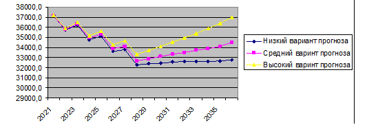 На рисунках 1, 2 и 3 рассмотрены изменения численности населения по вариантам прогноза на 2021 по 2035 годы трудоспособного возраста, моложе и старше его [2].