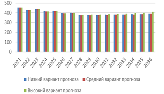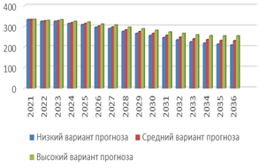 Рисунок 1 показывает, что за исследуемые периоды времени в соответствии с низким вариантом прогноза численность населения моложе трудоспособного возраста будет занижена, то есть в прогнозном будущем объем занятых будет меньше. И обратная ситуация наблюдается по высокому варианту прогноза, что более положительно в перспективе может отразиться на объеме занятого населения Российской Федерации.