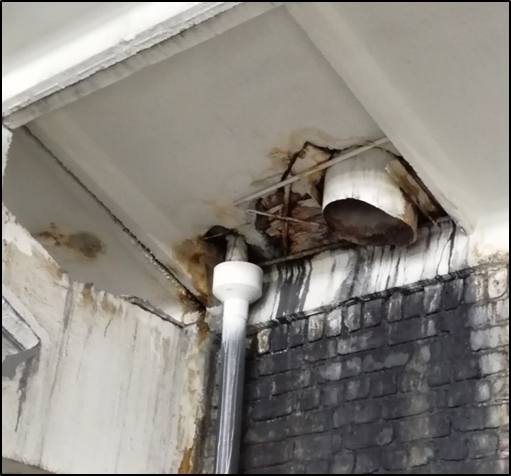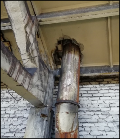 Механические повреждения полок – очень часто встречаемое повреждение. Механические повреждения в полках связаны с технологическим процессом, если, например, необходимо установить вентиляционный дефлектор или пропустить через конструкции кровли дымовую трубу (рис. 3, а). В таких случаях в полке плиты покрытия пробивается отверстие, вырезается рабочая арматура и устанавливается труба или дефлектор. Так же часто выполняются отверстия в плитах покрытия для прокладки системы ливневого водостока, тогда в пробитое отверстие устанавливается воронка с патрубком (рис. 3, б). В таких случаях сложно оценить техническое состояние плиты покрытия, поскольку отверстие вызвано технологической необходимостью и выполнить систему ливневого водостока другим образом не представляется возможным. Развития данного повреждения не происходит, и тогда техническое состояние плиты следует оценивать как работоспособное. Однако следует обратить внимание на края пробитых отверстий, чаще всего края не оштукатурены и видна торчащая арматура. В таком случае возможно разрушение краев, обнажение и коррозия арматуры, техническое состояние плиты следует оценивать как ограниченно работоспособное. Для устранения повреждения рекомендуется выполнить оштукатуривание бетона по краям отверстия с последующей побелкой или окраской водоэмульсионной краской.