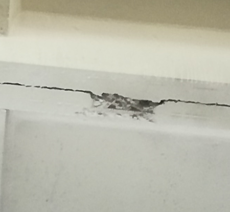 Продавливание полки плиты. Редкое повреждение, причиной появления которого является внешняя ударная приложенная нагрузка. В плите одного из производственных зданий в г. Таганрог было выявлено такое повреждение, явившееся результатом спила дерева – при падении ствол дерева продавил полку плиты покрытия. При этом арматурный каркас плиты покрытия выдержал нагрузку, и обрушения не произошло. При отсутствии повторных ударных нагрузок, развития данного повреждения не происходит, техническое состояние плиты покрытия оценивается в зависимости от степени поврежденности – работоспособное или ограниченно работоспособное. Устраняется повреждение зачеканкой трещин цементно-песчаным раствором или специальной ремонтной смесью для бетона.