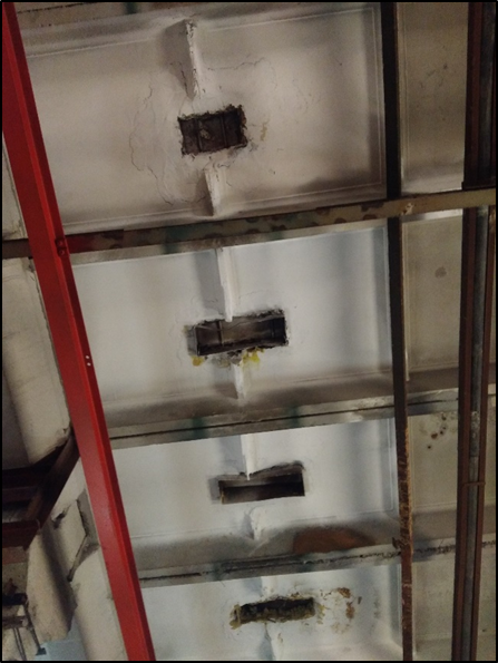 Механические разрушения поперечных ребер плит покрытия. Не часто встречаемый дефект плит покрытия. Встречается при необходимости установки на крыше дефлектора большого диаметра (рис. 6, а), при проходе дымовой трубы через конструкции кровли или при необходимости крепления технологического оборудования над плитой (рис. 6, б). Так как при размещении оборудования полностью перерезается арматурный стержень поперечного ребра плиты, то ее несущая способность уменьшается, соответственно, техническое состояние поврежденных плит покрытия необходимо оценивать как ограниченно работоспособное. Устраняется повреждение путем восстановления армирования ребра плиты и восстановления формы ребра из мелкозернистого бетона или из цементно-песчаного раствора. Чаще всего, восстановления ребра плиты выполняют по специально разработанному проекту.