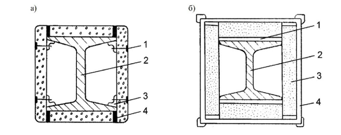 4 - цементный раствор; б) вермикулитовыми плитами: 1 – клей; 2 – колонна;