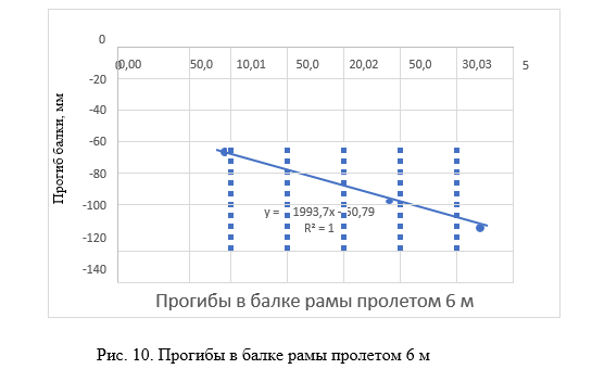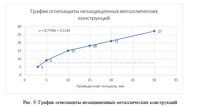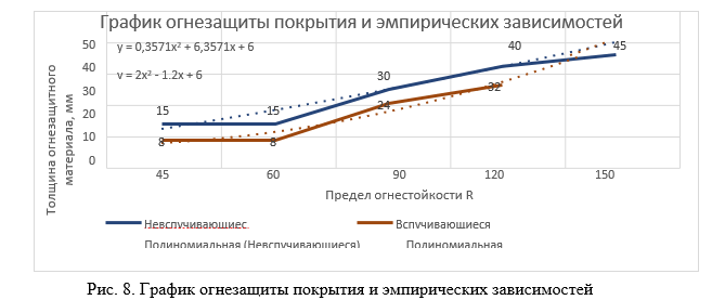 По результатам расчета наибольшее значение перемещений в 24 метровой балке при обработке её цементно-песчаным раствором. Данный является экономичным, но возникающие прогибы превышают допустимый предел по действующим нормам [9]. При нанесении вспучивающегося покрытия ОЗС-МВ толщиной больше 8 мм сопряжено с риском возникновения избыточных деформаций. Для расчёта нужной толщины слоя в таком случае можно воспользоваться эмпирической зависимостью, представленной далее на графике (рис. 10).
