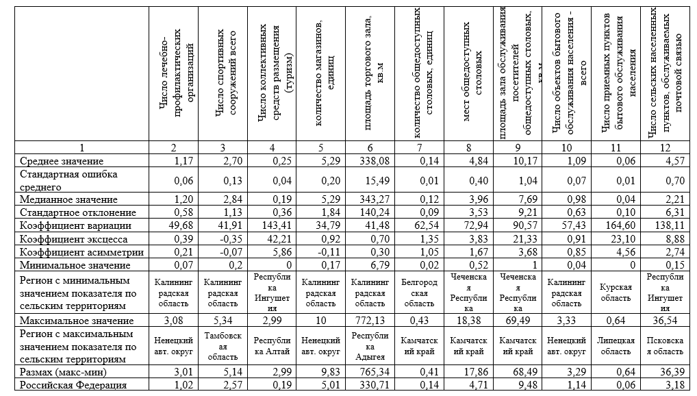 Методы исследования. Для основных показателей, характеризующих уровень развития социального и инженерного обустройства сельских территорий регионов Российской Федерации в расчете на 1 тыс. сельских жителей (здравоохранение, спорт, туризм, торговля, услуги, связь, инвестиции, строительство жилья, жилищные условия) были рассчитаны статистические характеристики показателей: среднее значение, стандартная ошибка среднего, медианное значение, стандартное отклонение, коэффициент вариации, размах, позволяющие определить степень дифференциации субъектов по уровню развития социальной инфраструктуры. Для расчетов использованы статистические сборники [1, 2].