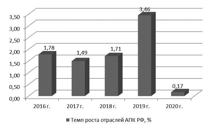 Сравнительный анализ информации, представленной на рисунках 1 и 2 показывает, что в 2016 г., 2019 г. и 2020 г. отрасли российской экономики, связанные с сельскохозяйственным производством и агропромышленным комплексом демонстрировали более высокий темп роста по сравнению с валовым внутренним продуктом РФ, в целом. Подобная технеция укрепилась в период 2019-2020 гг. В частности, в 2019 г. ВВП РФ вырос на 2,20 %, рост отраслей АПК на 1,26 % превзошёл показатель ВВП РФ и составил 3,46 %. В 2020 г. ВВП РФ сократился на 2,68 %, отрасли АПК выросли на 0,17 %