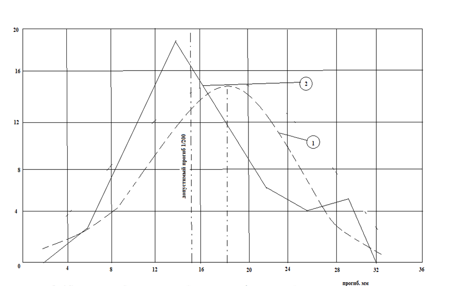 Экспериментальные значения распределения прогибов (рис. 1) выявили, что большая их часть не превышает вершины нормального распределения. Однако вершина экспериментальной кривой находится выше. При прогибах до 25 мм кривая экспериментального распределения повторяет очертания и приближена к нормальной. Это свидетельствует о естественном разбросе значений прогибов в этих пределах.