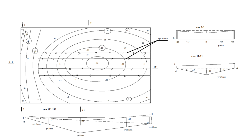 Форма изгиба поверхности плит перекрытий, определенная по пяти поперечным сечениям, соответствует балочной работе с максимальным прогибом в середине плиты (рис. 3). Исключение составляет сечение плиты в характерном месте опирания ее на гипсобетонную межкомнатную перегородку.