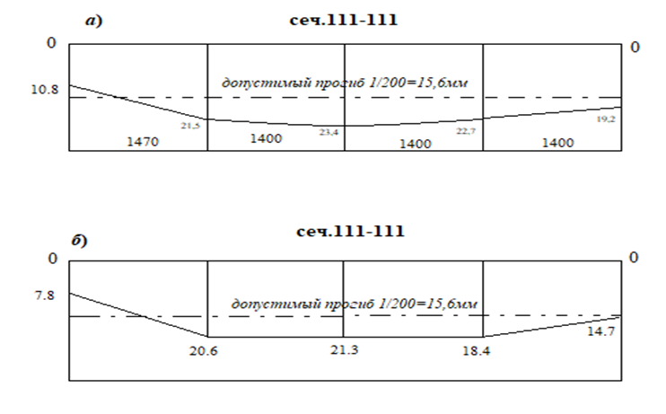 Увеличение толщины защитного слоя бетона плит повлияло также на величину длительного прогиба. По расчету, увеличение толщины защитного слоя до 30 мм приводит к двухкратному увеличению прогиба. При повторном нагружении равномерно распределенной нагрузкой плиты перекрытия, имевшей после снятия эксплуатационной нагрузки, остаточный прогиб 20 мм, прогибы ее были практически в 2,5 раз больше расчетных. Такие отклонения могли быть вызваны также отклонениями фактического модуля упругости бетона от проектного.
