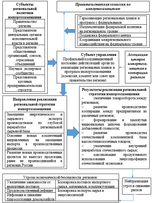 Принципиально важным является обеспечение взаимодействия регионов и федерального центра (в лице Правительственной комиссии по импортозамещению) в вопросах реализации национальной стратегии импортозамещения. В данном случае речь идет о следующих аспектах взаимодействия: гармонизация региональных планов и программ с федеральными; имплементация федеральной политики на региональном уровне; поддержка федерального центра отдельных региональных проектов и программ; координация межрегионального взаимодействия на федеральном уровне.