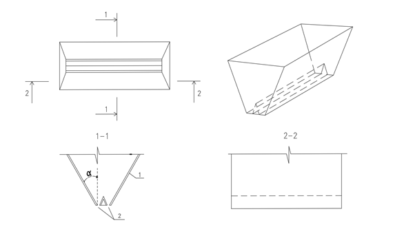 Рис.2. Конструкция бункера подачи фибробетонной смеси для бетонирования линейных элементов с направленной ориентацией фибр: 1 – стальные стенки бункера; 2 – место выхода фибробетонной смеси из бункера