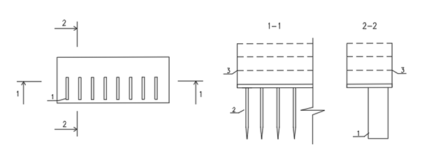 Рис.3.  Конструкция гребенки мобильной установки для бетонирования линейных элементов с направленной ориентацией фибр: 1 – выравнивающие ножи; 2 – выравнивающие ножи; 3 – направляющие для варьирования высоты гребенки