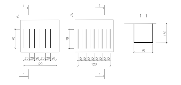 Окончательное ориентирование фибр происходит непосредственно в опалубке при контакте фибробетонной смеси с продольно расположенными элементами (ножами) гребёнок, конструкция которой представлена на рис.3. При этом, расстояние между ориентирующими элементами гребёнки больше, чем размер крупного заполнителя, но намного меньше длины фибр. Это позволяет крупному заполнителю свободно проходить между ножами гребёнок, но принуждает фибры, при контакте с ними, целенаправленно ориентироваться вдоль движения установки.