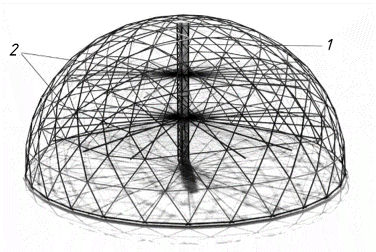 Изобретение, представленное на рисунке 3, разработанное в России, относится к сельскому хозяйству, к выращиванию растений в теплицах, а именно к конструкции купольной теплицы с двойным каркасом [2]. Двухкупольная теплица содержит два сферических каркаса, расположенных один в другом с зазором. Наружный каркас выполнен из оцинкованных труб и покрыт износостойким прозрачным материалом. Внутренний каркас повторяет конструкцию наружного каркаса и имеет покрытие из прозрачных надуваемых секторов, подвешен к наружному каркасу при помощи подвесов. Такое выполнение обеспечивает сохранение тепла в теплице при минусовых температурах, а также увеличивает износостойкость наружного и внутреннего куполов теплицы.