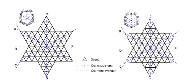 Также исследуя триангуляционные развертки и формы симметрии 6 m (рис.5), наиболее очевидным является установка шпренгелей для стабилизации геометрически изменяемой части параллельно всем осям триангуляции [3-5].