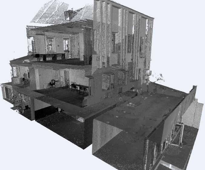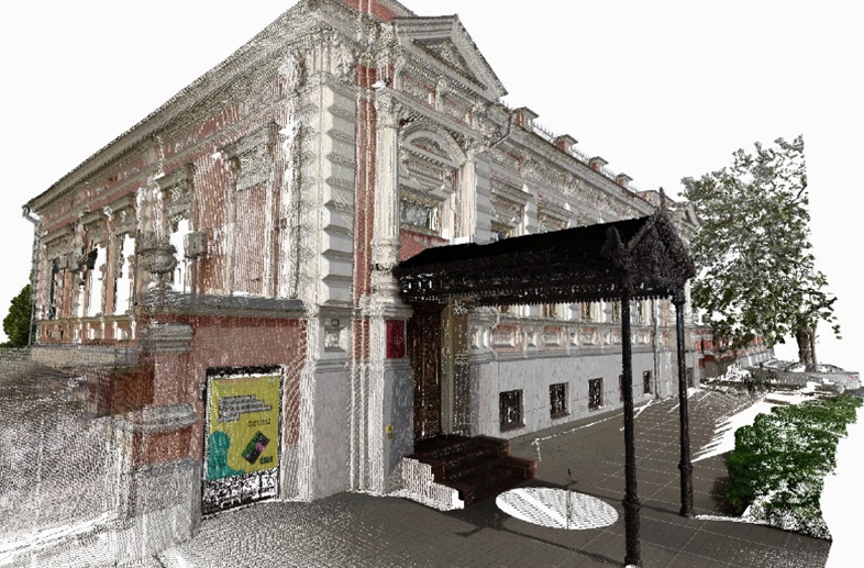 Принцип работы 3D сканера заключается в использовании определённого вида излучения и сканирования объекта через отражение света или прохождение излучения через объект или среду. Сканирование производится по станциям, а камеральная обработка полученных данных производится в программе ReCap в единую BIM модель. В результате получают облако точек, представляющее собой массив, где каждая точка имеет индивидуальные координаты. В облаке точек отражены данные о геометрии сложных архитектурных форм, элементов лепного декора экстерьера и интерьера объекта, расположение объектов в пространстве (внутреннее пространство помещений – расположение оборудования или его отдельных частей, попадающих в область съемки, систем инженерного обеспечения и др.).