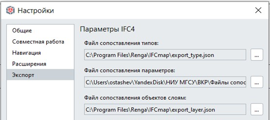 Выполнить такое разделение консолидированной модели в Renga можно как раз с помощью IFC маппинга, который состоит из файлов сопоставления, написанных на скриптовом языке Json. На Рис. 3 приведён скриншот окна настроек Renga для экспорта ЦИМ в формат IFC, где как раз видны файлы сопоставления, которые идут первыми тремя строками.