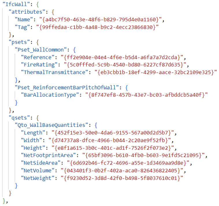Файл сопоставления параметров (Рис. 5) позволяет сопоставить свойства, параметры и расчётные характеристики объектов Renga со спецификацией IFC. Синтаксис Json в данном случае использует форму – объект. Пример файла сопоставления параметров представлен на Рис. 5.