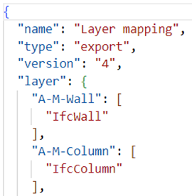 Файл сопоставления объектов слоям (Рис. 6) позволяет сопоставить определённые типы объектов в слой IFC. Разделение объектов по слоям поможет в навигации и поиске при последующей работе с цифровой информационной моделью. Синтаксис Json в данном случае использует форму – массив. Пример файла сопоставления объектов слоям представлен на Рис. 6.
