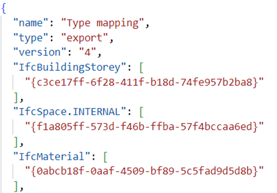 Файл сопоставления типов позволяет сопоставить целиком все объекты, выполненные определённым инструментом Renga, соответствующим классам IFC, например Стена – IfcWall, Колонна – IfcColumn, Перекрытие – IfcSlab и т.д. Данная операция возможна, благодаря тому, что в Renga есть соответствующие константы инструментов объектного моделирования (идентификатор на все объекты, выполненные определённым инструментом). Синтаксис Json в данном случае использует форму – массив. Пример файла сопоставления типов приведён на Рис. 4.