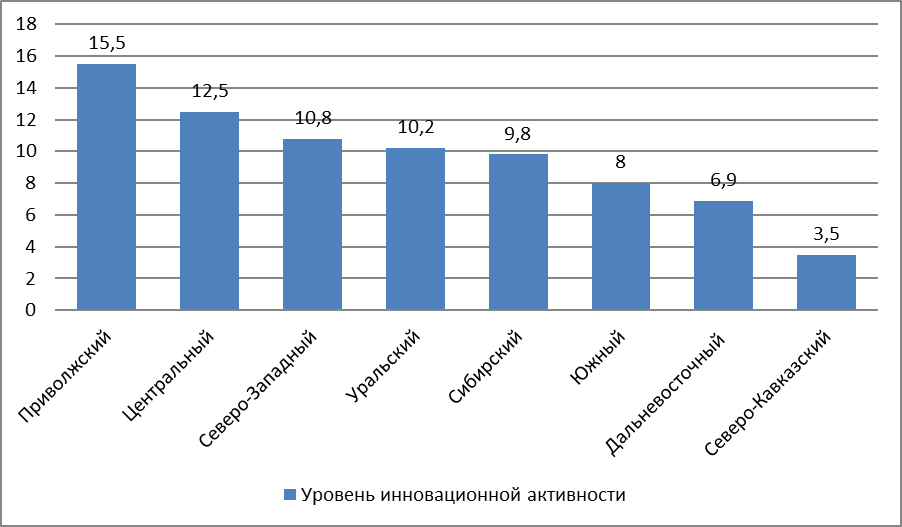 Как видим из статистических данных самым активным по уровню инновационного развития, наличия инновационной инфраструктуры является Приволжский федеральный округ с показателем 15,5 %.