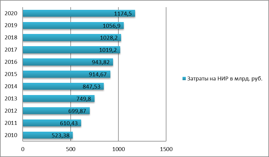 По данным статистический исследований объем затрат на научно-исследовательские разработки по всем субъектам РФ в 2020 году составило 1174,5 млрд. руб., что больше на 200 млрд. руб., от плановых показателей. Объем финансирования НИР за последние годы показывает нарастающую динамику, что может свидетельствовать о положительном экономическом эффекте от разработки и внедрения инновационных технологий в бизнес среду.