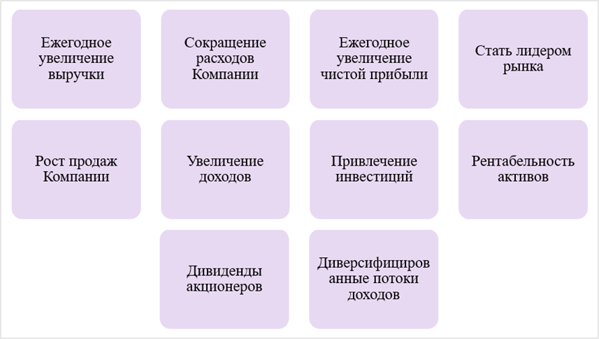 Финансовая цель компании состоит в том, чтобы обеспечить получение прибыли от вложенных инвестиций и управлять ключевыми рисками, связанными с ведением бизнеса. Эта цель может быть достигнута путем удовлетворения потребностей всех участников бизнеса, таких как акционеры, клиенты и поставщики [8]. Акционеры являются поставщиками капитала и хотят быть уверены, что компания постоянно генерирует доходы и что достигает таких целей, как повышение прибыльности и развитие новых источников дохода. Шаги, предпринятые для достижения таких целей, могут включать внедрение новых продуктов и услуг, улучшение ценностного предложения компании и сокращение затрат на ведение бизнеса [8].
