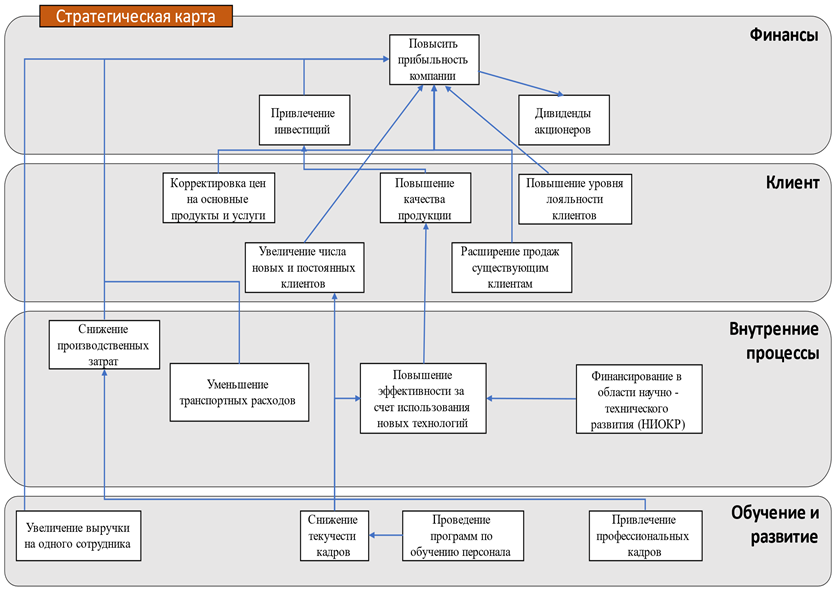 Следующим этапом разработки ССП было построение стратегической карты компании как графической формализации логической причинно-следственной связи между стратегическими целями, обеспечивающей наиболее информативный и понятный руководству инструмент визуализации процесса создания ценности компании (рис. 7).
