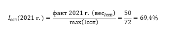 Завершается система оценки эффективности управления бизнесом расчетом интегрального показателя эффективности на основе показателей ССП (Iссп) с учетом их значимости, оцениваемой по шкале от 1 до 5. В 2021 г. максимально возможное значение Iссп составляет 72, рассчитанное как сумма значений по графе 6 таблицы 3:
