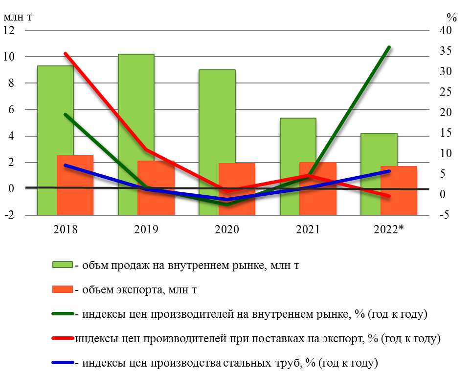 Рисунок 2. Динамика изменения конъюнктуры рынка трубной продукции за 2018-2022 годы. Источник: составлено автором по данным Росстат, Ru-Stat, ФТС РФ, официальные сайты трубопрокатных предприятий (годовая отчетность)