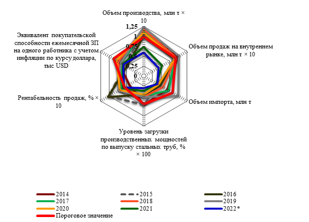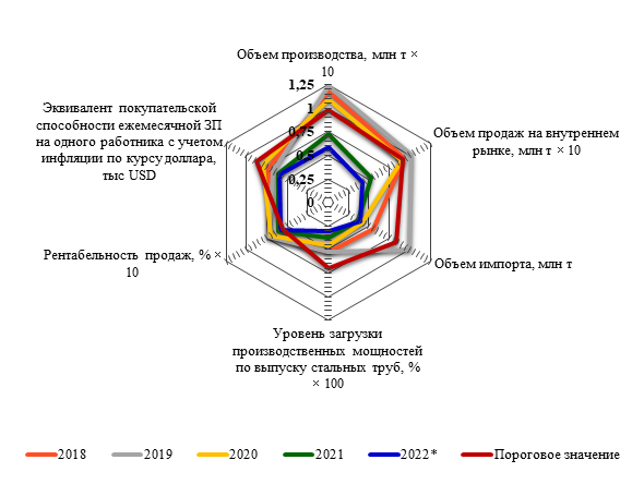 Рисунок 6. Радар экономической безопасности трубопрокатной отрасли РФ за 2018-2022 годы (номинальные значения основных показателей).