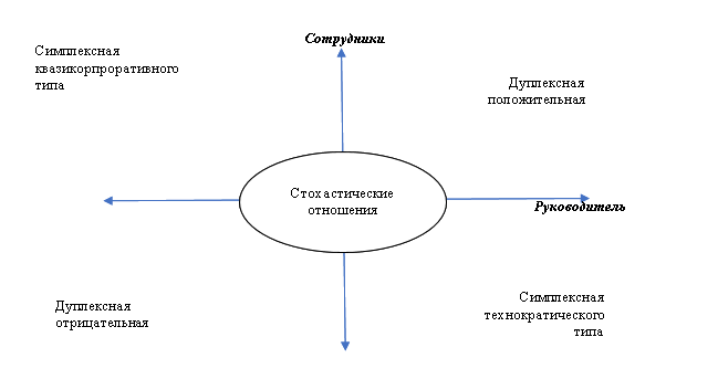 Результат 2. Типы социально-структурных отношений руководителей с сотрудниками организации. Типы социально-структурных отношений руководителей с сотрудниками организации могут быть различными. Они формируются в зависимости от наложения, корреляции (сочетания или противостояния) их ценностей как ценностей субъектов - носителей различных знаний, навыков и умений – как носителей человеческого капитала с различной направленностью. В этой связи между руководителями и сотрудниками корпораций могут складываться отношения различных типов: 1. Дуплексная положительная связь (Такие связи возникают в тех случаях, когда руководитель и подчиненный способны к информационному, когнитивному и эмоциональному обмену и взаимопониманию как в решении вопросов производства, так и в вопросах социального порядка – формирования групповых отношений – сплоченности и интеграции); 2. Дуплексная отрицательная связь (Напротив, это система отношений, характеризующаяся взаимными противостояниями как ценностей делового, так и ценностей социального порядка. Корреляция таких отношений отрицательна, при этом отрицательная корреляция характерна как для деловых, так и коллективистских отношений); 3. Симплексная связь квазикорпоративного типа (Это тип связи, при которой между руководителем и персоналом сформированы единые представления о социальных характеристиках организации, отношений групповой сплоченности, взаимопонимания и пр., но при этом сложилось неоднозначное, противопоставленное восприятие и понимание отношений в процессе производства, для деловых отношений характерны существенные различия и конфронтация); 4. Симплексная связь технократического типа (Такие сети отношений складываются между руководителем и сотрудниками на основе единого понимания производственных, деловых связей, но при этом социальные, групповые ценности в данном случае формируются как противоречивые или конфликтные); 5. Стохастическая ситуационная связь (Это сети отношений, в которых связанность ценностей руководителя и ценностей сотрудников корпорации, как деловых, так и социальных, близка к нулю, т.е. в связях между руководителем и сотрудниками не выражены ни положительные, ни отрицательные связи, как в групповых отношений, так и в отношениях в сфере производства). Условно типы таких отношений могут быть представлены, как показано на рисунке 2.