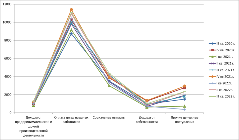 По данным таблицы 2. наблюдаем увеличение денежных доходов в 2022 году по сравнению с 2021 годом за три квартала, которые имеют тенденцию к росту по всем видам поступлений, кроме прочих денежных поступлений, по которым наблюдается снижение за 1 квартал 2022 года на 367 млрд. рублей по сравнению с 1 кварталом 2021 года. В анализируемых периодах наибольший удельный вес в структуре денежных доходов занимает оплата труда наемных работников, составившая 57,3% в 2021 году и 55,32% в третьем квартале 2022 года. Наименьший удельный вес занимают доходы от предпринимательской и другой производственной деятельности (5,5% в 2021 году и 6,4% в третьем квартале 2022 года), а также доходы от собственности (5,7% в 2021 году и 5,0% в третьем квартале 2022 года).