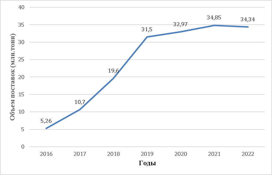 Рис. 2. Грузооборот Северного морского пути, млн. т (2016 – 2022 г.) [6-7]
