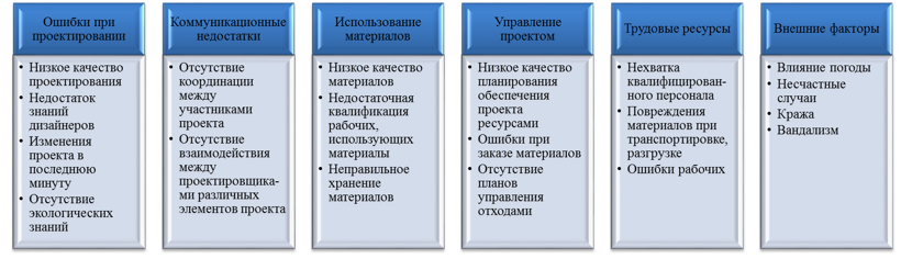 Отходы в ходе строительства новых объектов в основном образуются из-за неправильных расчётов, ошибок проектирования, непродуманных закупок и нерационального планирования, неэффективной обработки материалов, образующихся остатков сырья и неожиданных изменений в конструкции здания [10]. Если проанализировать основные причины образования отходов на строительных площадках [11, 12], то укрупненно их можно свести к следующим группам (Рисунок 4).