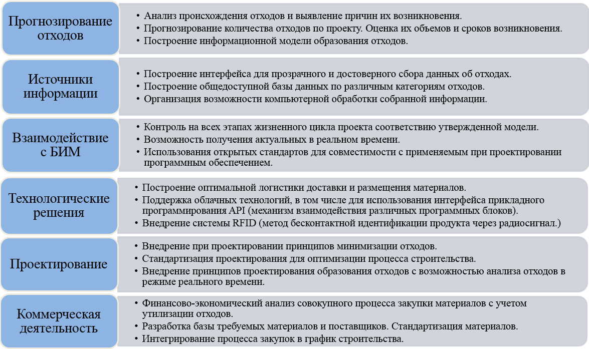 Проведя анализ группировок причин возникновения строительных отходов и мирового опыта применения BIM-технологий для решения данных проблем, автором статьи выработаны рекомендации по реализации конкретных мероприятий по различным направлениям работы с отходами (рисунок 7).