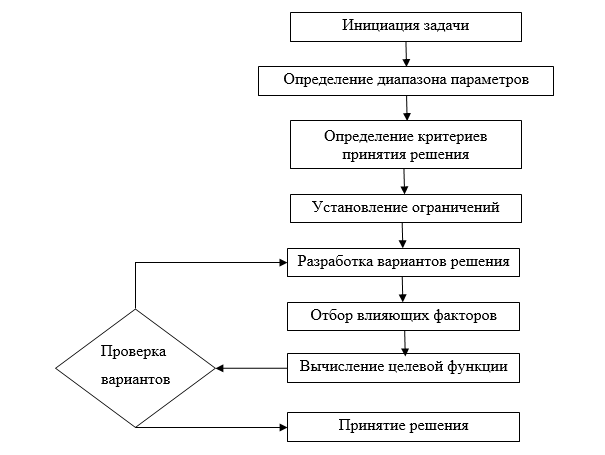 На рисунке условно показана только одна обратная связь: возврат к перебору вариантов в тех случаях, когда вариант не удовлетворяет установленным ограничениям, или когда вариант не эффективен по сравнению с рассмотренными ранее. Однако в реальных ситуациях возможен возврат на более ранние этапы принятия решений. Например, в случаях, когда ни один из вариантов не удовлетворяет установленным ограничениям, последние могут быть смягчены.
