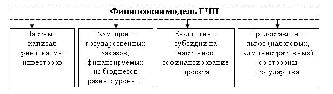 Важной формой реализации проектного управления в рамках финансового менеджмента является государственно-частное партнерство (ГЧП). Развитие такого партнерства для целей финансового менеджмента повышает эффективность государственных расходов. Оптимальное распределения рисков и ответственности в системе финансового менеджмента направлено на привлечение инвестиций. Финансовая модель ГЧП представлена на рисунке 1.