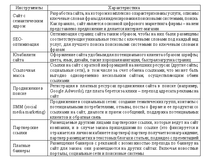 Таблица 1 – Инструменты интернет-маркетинга для повышения эффективности коммуникаций в цифровом маркетинге