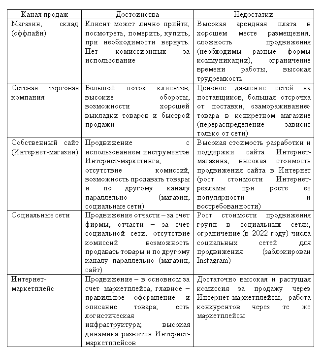 Таблица 2 – Достоинства и недостатки каналов продаж