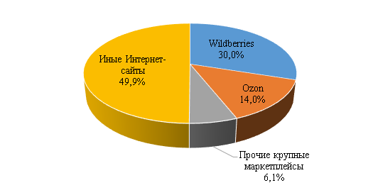 Активное развитие Интернет-маркетплейсов способствует росту продаж через них и увеличению их доли на рынке Интернет-торговли. Тем более, маркетеплейсы имеют собственную логистическую систему доставки товара и выдачи, отчего поставщик не должен передавать товар на хранение на склад, при покупке клиентом товар через эту логистическую систему отправляется до пункта выдачи. Лидерами стали Wildberries, Ozon, а также СберМегаМаркет, AliExpress Россия, Яндекс.Маркет, Avito [18]. При этом, в 2022 году разделение данного рынка между участниками выгледело следующим образом (рис.6):