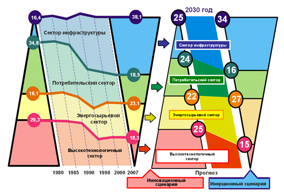 В рамках инерционного сценария доля энергетического сектора предполагалась к увеличению до 27%, а доля высокотехнологического сектора экономики должны была снизиться до 15%. В оптимистическом сценарии драйверами роста экономики был потребительский сектор, который предполагалось увеличить до 24%, а также высокотехнологическое производство с долей в 25%.