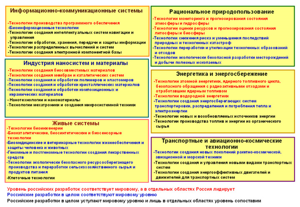 В докладе акад. Б.Н. Кузыка были также определены сферы, в рамках которых у нашей страны лидирующие позиции в мире («красная зона»), а также сферы, где наши разработки являются конкурентными и в целом соответствуют мировому уровню («синяя зона»). Также были определены сферы, где уже в 2008 г. наблюдалось наше стратегическое отставание («черная зона») Все вышеперечисленные сферы представленаы на рис.2.
