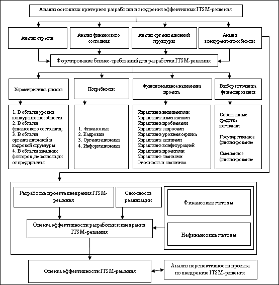 2. Алгоритм разработки и внедрения эффективных ITSM решений Анализ основных критериев для разработки и внедрения ITSM решения, проведенный на основе изучения опыта лучших практик [16], включает анализ отрасли (в качестве инструментов могут быть использованы такие методы, как SWOT-анализ, PESTEL-анализ, метод М. Портера по анализу конкурентных сил, анализ жизненного цикла отрасли) [17]; анализ финансового состояния предприятия; анализ денежных потоков; анализ организационной структуры предприятия (оценка организационной культуры, анализ структуры предприятия, анализ управленческих процессов) и анализ конкурентоспособности предприятия (анализ конкурентной среды, анализ потребностей клиентов, анализ потенциальных рисков в связи с изменениями в конкурентной среде [18]. Формирование бизнес-требований заключается в формировании списка ключевых заинтересованных лиц (стейкхолдеров) и их потребностей, цели создания системы (например, улучшение качества обслуживания клиентов, улучшение контроля и мониторинга), критериев достижения и существующих и возможных ограничений для внедрения ITSM решения (поиск источника финансирования, отсутствие квалификации у сотрудников, ограничение по времени, связанные с процессом разработки и внедрения). Этап разработки проекта внедрения ITSM решения должен полностью покрывать все бизнес-требования проекта, в случае нехватки финансирования на покрытие всех бизнес-требований, должны быть покрыты хотя бы требования ключевых стейкхолдеров, иначе проект по внедрению ITSM решения считается неуспешным. При этом оценка эффективности разработки и внедрения ITSM решения может выполняться с помощью финансовых и нефинансовых методов оценки. Эффективность ITSM решения также включает оценку перспективности проекта, определяемую на основе комплексного мнения различных заинтересованных сторон, которая имеет безусловную связь с финансовыми результатами деятельности компании-заказчика и может выражаться объективными преимуществами. Во-первых, повышением доступности сервисов и качества оказываемых услуг: ITSM-решение позволяет оперативно реагировать на инциденты и проблемы, а также улучшать управление процессами обслуживания клиентов. Более высокая доступность сервисов и улучшенное качество услуг приводят к удовлетворенности клиентов и повышению их лояльности. Это может привести к удержанию существующих клиентов и привлечению новых, увеличению объема продаж и повышению выручки. Во-вторых, более удобный способ получения поддержки по любым видам услуг: ITSM-решение обеспечивает централизованный сервис-деск и самообслуживание пользователей, что делает процесс получения поддержки более удобным и эффективным. Это позволяет снизить нагрузку на отдел информационных технологий и сократить время, затрачиваемое на решение типовых запросов. Уменьшение затрат на поддержку и обслуживание помогает оптимизировать бюджет и улучшить финансовые показатели предприятия. В-третьих, достоверная информация и наличие измеримых показателей для оценки эффективности работы отдела информационных технологий: ITSM решение предоставляет инструменты для сбора, анализа и отчетности о ключевых показателях производительности и эффективности отдела информационных технологий. Это позволяет оценить эффективность внутренних процесс