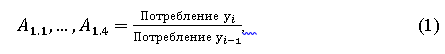 где y – вид моторного топлива, i – расчетный период (календарный год), диапазон присваиваемых баллов [0;1,5], для расчета А1.2, ..., А1.4 также применяется Формула 1.