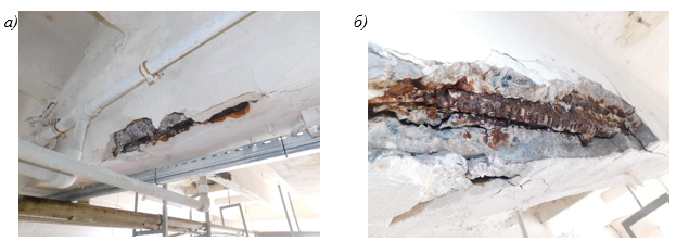 Рис. 2. Вскрытие защитного слоя бетона конструкций перекрытия: а – вскрытие защитного слоя бетона ригеля;