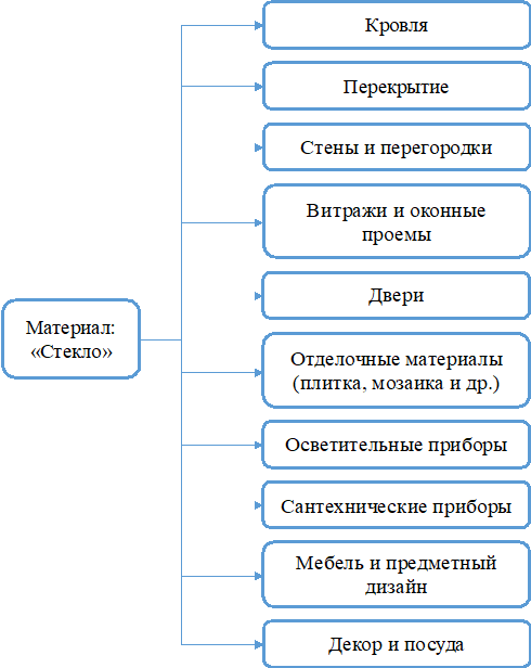 В архитектуре и дизайне стекло используется в виде наружных и внутренних ограждающих конструкций, заполнения оконных и дверных проемов, перегородок, отделочных материалов, мебели, освещения и декора помещений (рис. 1).