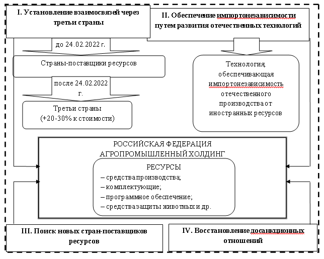 Таким образом, с учетом сложившихся геополитических изменений решение проблемы развития субъектов аграрной и агропродовольственной сферы в целом в условиях санкционного давления, на наш взгляд, возможно тремя способами.