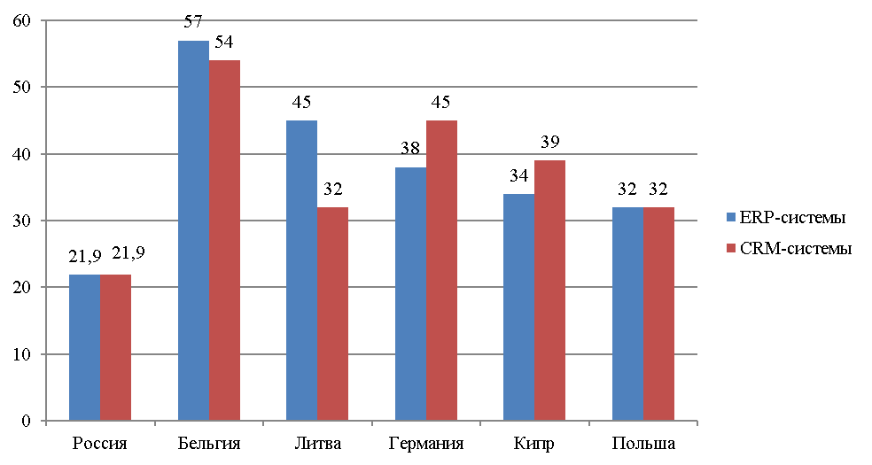 Как видно из данных рисунка 2, наилучших результатов в распространении ERP-систем и CRM-систем в бизнесе достигла Бельгия (более половины обследованных организаций используют рассматриваемые системы), в Литве 45 % организаций применяют цифровые системы управления, 32 % организаций – CRM-системы для установления взаимоотношений с потребителями, широкое распространение CRM-системы получили в Германии (45 % обследованных организаций, что более чем вдвое выше результата, достигнутого в России). Успешно развивает процессы цифровой трансформации бизнеса также Польша, что сопровождается ростом спроса на специальные программные продукты, позволяющие реализовать возможности цифрового маркетинга: около трети польских компаний активно применяют CRM-системы и ERP-системы.
