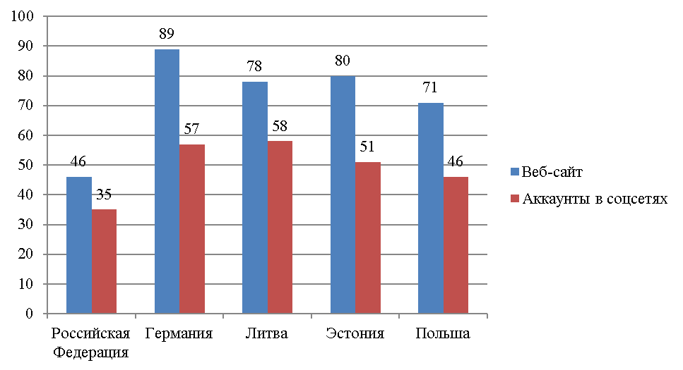 Как видно из рисунка 4, в европейских странах абсолютное большинство организаций активно применяет веб-сайты для коммуникаций с потребителями и контрагентами, ведения рекламной деятельности, сбора «больших данных» (так, в Литве веб-сайты имеют 78 % организаций, в Германии – 89 %, в Польше – 71 %), быстро расширяется также применение аккаунтов в социальных сетях. Отставание российского бизнеса от зарубежной практики не позволяет должным образом применять цифровые маркетинговые инструменты для достижения поставленных целей.